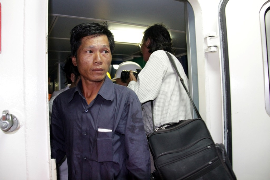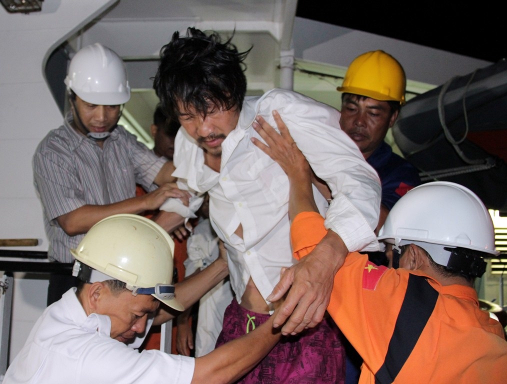 | Các ngư dân được đưa ra xe đến bệnh viện điều trị, chăm sóc sức khỏe. Trên gương mặt họ vẫn còn sợ hãi, hốc hác. |