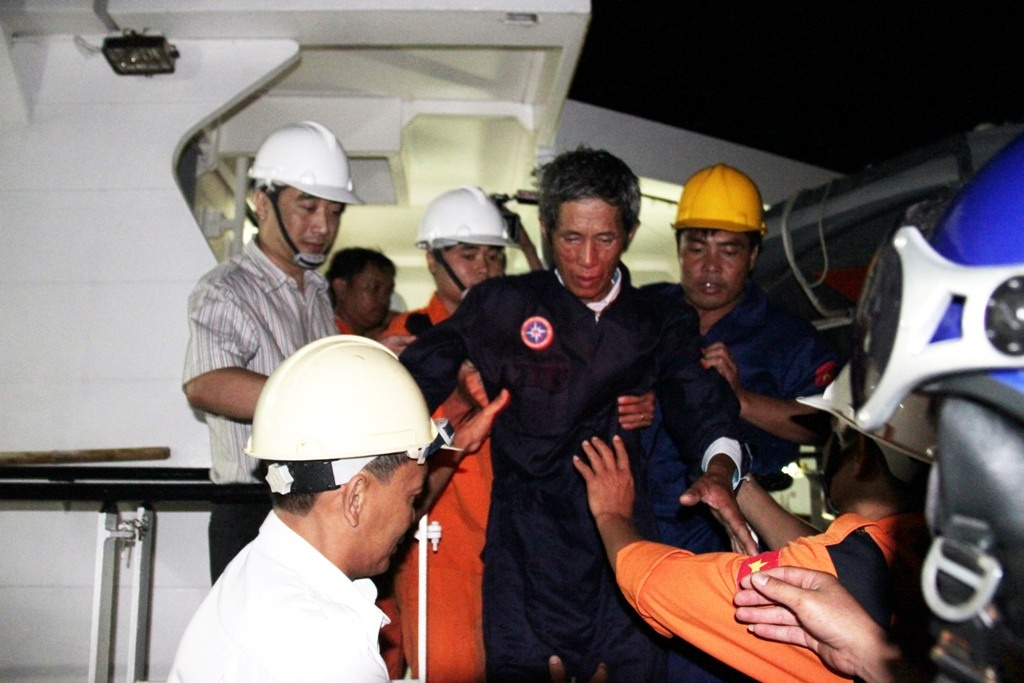 | Anh Nguyễn Văn Hồng, người cứu cháu Bé, bị thương nặng ở chân và sức khá yếu được nhân viên cứu hộ dìu từ tàu SAR 272 lên bờ. |