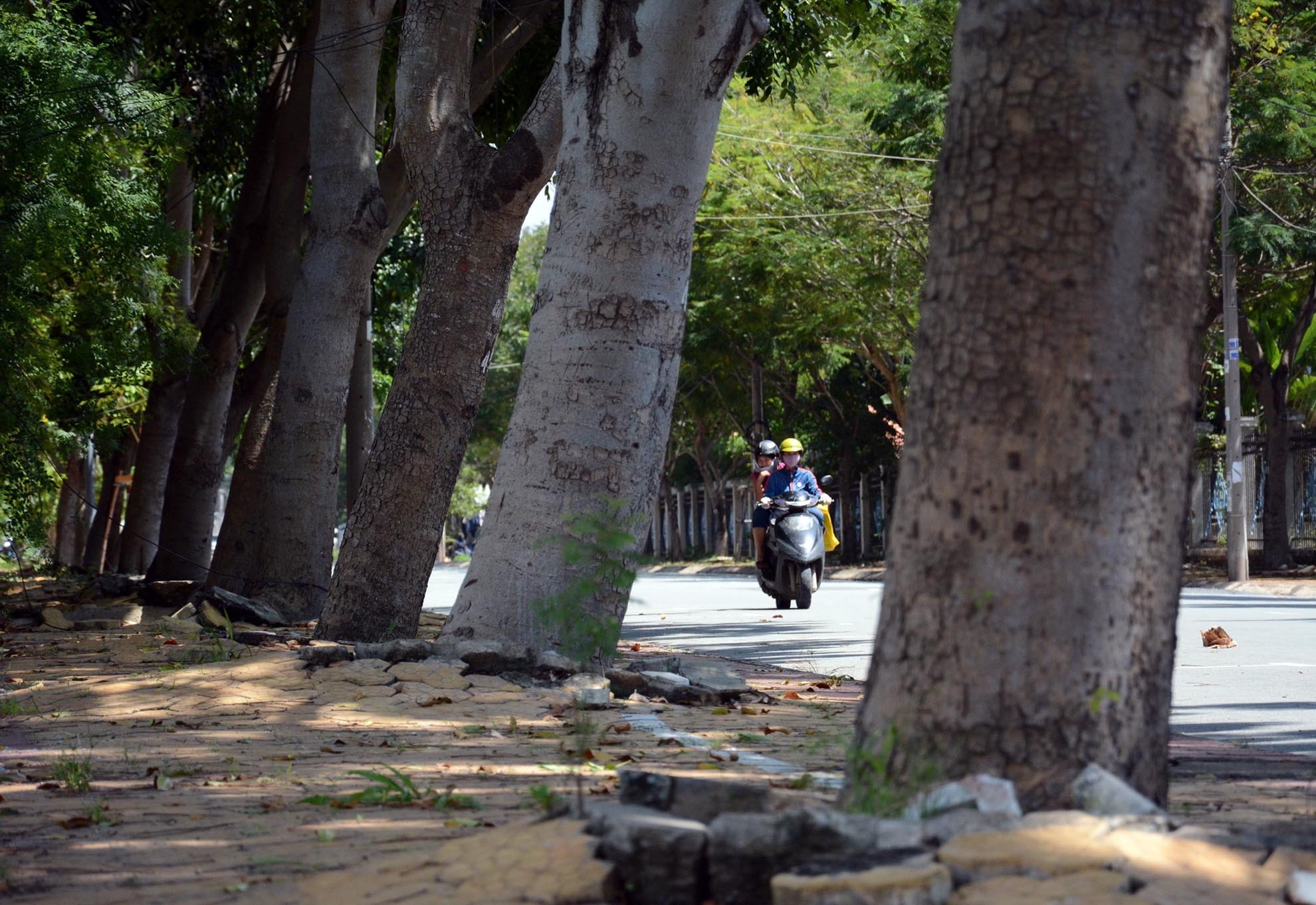 | Theo khu quản lý giao thông đô thị số 2, những cây xanh trên đường này đang bị ảnh hưởng bởi tình trạng ngập nước, các công trình xây dựng, cải tạo cơ sở hạ tầng, do đó rễ cọc không thể phát triển. Mặt khác rễ nhiều cây sọ khỉ nổi lan trên bề mặt gây nứt vỉa hè khiến cây dễ bị ngã đổ khi có mưa kèm gió lớn. Các cây loại 2 chiếm tỷ lệ phần lớn tổng số cây dự định đốn bỏ, khả năng sống và phát triển các cây này khi bứng dưỡng rất thấp. Bên cạnh đó, chi phí bứng, chăm sóc cây còn cao hơn việc trồng, chăm sóc cây mới. Cây sọ khỉ vốn thuộc danh mục cây cấm trồng ở TP.HCM. Trong ảnh, những cây sọ khỉ rễ nổi lan trên bề mặt gây nứt vỉa hè đường Nguyễn Văn Hưởng. |