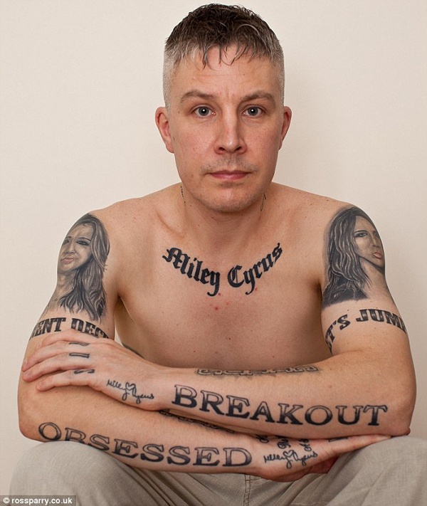 Một người đàn ông 40 tuổi tên Carl McCoid đã chi ra hơn 500 bảng Anh xăm mình 22 hình trên da để bày tỏ tình cảm với “công chúa Disney” Miley Cyrus. Carl thừa nhận ngôi sao nhạc pop đã giúp anh vượt qua được cuộc hôn nhân đổ vỡ với vợ mình.