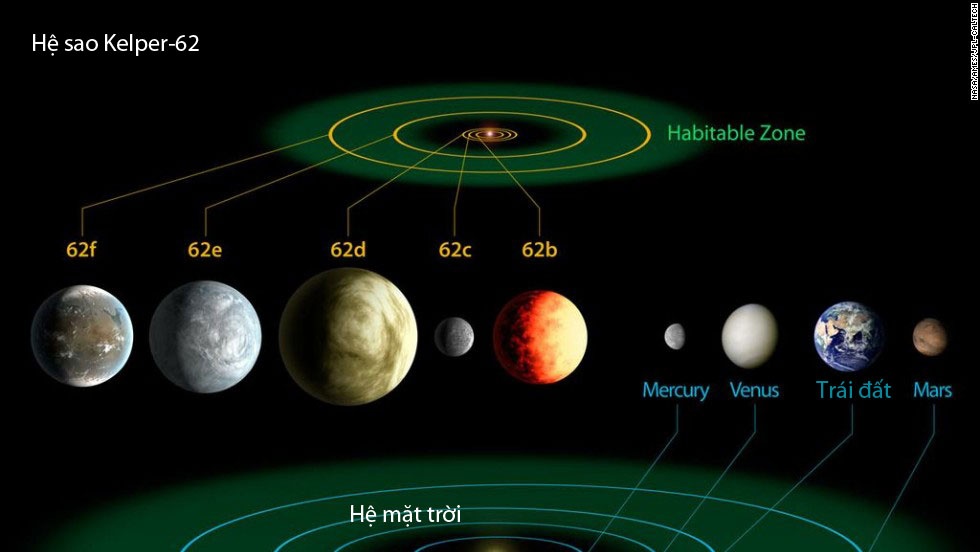 So sánh hệ sao của Kepler-62e/f với Thái dương hệ. |