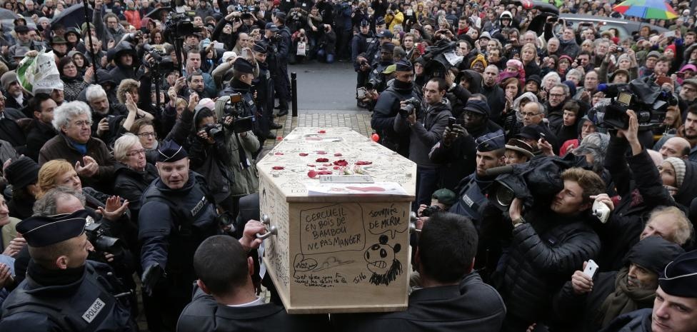 Quan tài đầy tranh biếm họa của một trong các họa sĩ thiệt mạng trong vụ xả súng tòa soạn tạp chí Charlie Hebdo tại lễ tang ở Montreuil, gần thủ đô Paris hôm 15/1. Hai kẻ cực đoan tiến hành vụ tấn công tòa soạn báo đã bị cảnh sát tiêu diệt.