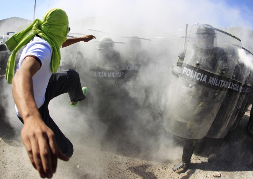 Kẻ quá khích tấn công cảnh sát vũ trang ở khu quân sự tại Iguala, Guerrero, Mexico hôm 12/1. Phong trào biểu tình ở Mexico sau vụ 42 sinh viên biến mất bí ẩn vẫn chưa có dấu hiệu hạ nhiệt.