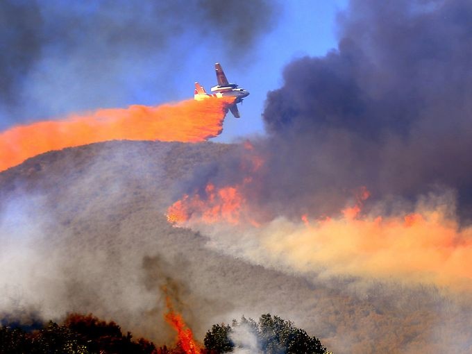 Máy bay rải hợp chất chữa cháy để dập tắt hỏa hoạn trên một cánh rừng tại hạt Lake, bang California, Mỹ hôm 3/9. Ảnh: AP |