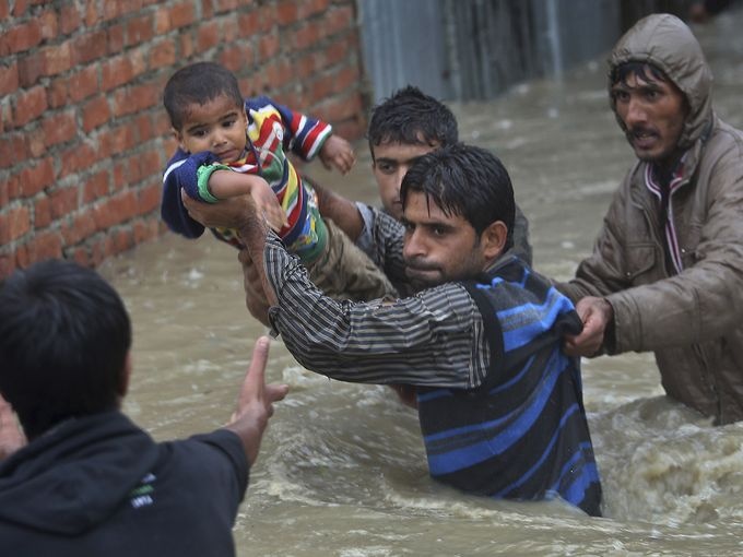 Người dân sơ tán những đứa trẻ khỏi vùng nước bị nước lũ nhấn chìm tại Srinagar, Ấn Độ hôm 4/9. Ảnh: AP |