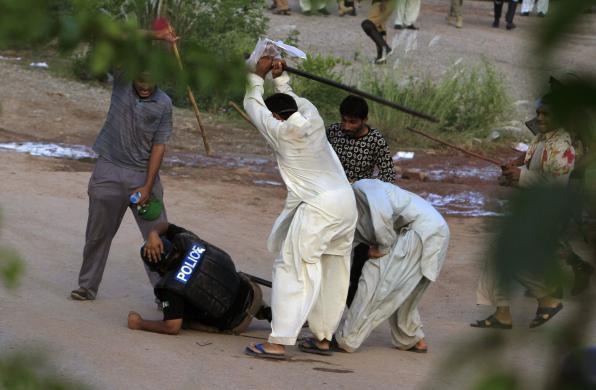 Người biểu tình chống chính phủ tấn công một cảnh sát chống bạo động ở Islamabad, Pakistan hôm 1/9. Làn sóng biểu tình bùng lên trong trong nhiều tuần qua nhằm hạ bệ Chính phủ của Thủ tướng Pakistan đương nhiệm Nawaz Sharif. Ảnh: Reuters |