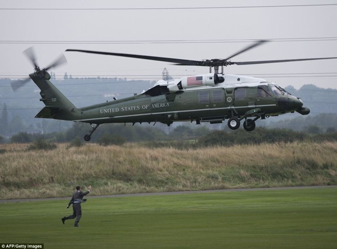 Trực thăng Marine One đưa Tổng thống Obama rời căn cứ không quân Hoàng gia Anh tới khu nghỉ dưỡng Celtic Manor ở Newport, Wales một ngày trước khi diễn ra hội nghị thượng đỉnh NATO, dự kiến kéo dài trong ngày 4 và 5/9. Ảnh: Getty |