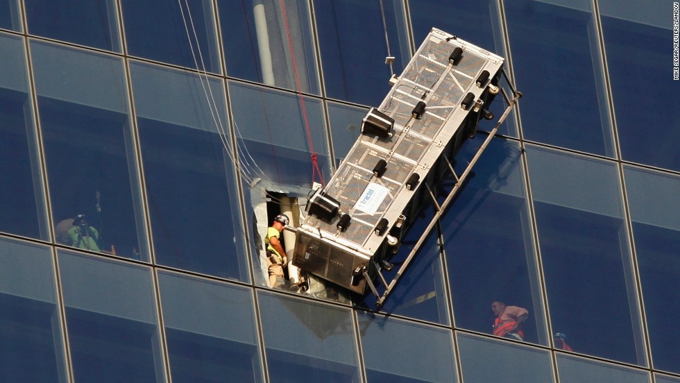 Lực lượng cứu hộ New York cắt kính bao quanh tòa nhà Trung tâm Thương mại Thế giới mới được khánh thành để giải cứu hai công nhân vệ sinh bị mắc kẹt hôm 12/11. Tòa nhà mọc lên ở khu vực tháp đôi Trung tâm Thương mại Thế giới bị đánh sập trong vụ khủng bố ngày 11/9/2001. Hai công nhân vệ sinh mắc kẹt ở tầng thứ 69 của tòa nhà. Ảnh: Reuters