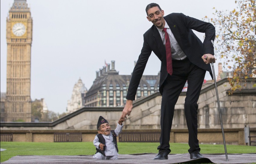 | Chandra Bahadur Dangi, người đàn ông lùn nhất thế giới hội ngộ với Sultan Kosen gã khổng lồ cao nhất hành tinh ở London, Anh hôm 13/11. Họ gặp nhau trong dịp 10 năm ngày thành lập Sách kỷ lục Guinness. Ảnh: AFP |