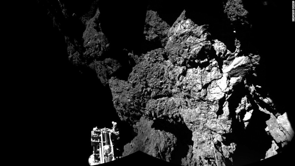 Thiết bị đổ bộ Philae của tàu thăm dò sao chổi Rosetta chụp hình bề mặt của thiên thể được đặt tên là 67P hôm 13/11. Philae là tàu thăm dò đầu tiên của con người có thể đặt chân lên một sao chổi khi nó lang thang trong không gian. Sao chổi 67P đang ở cách trái đất khoảng 500 triệu km. Ảnh: ESA