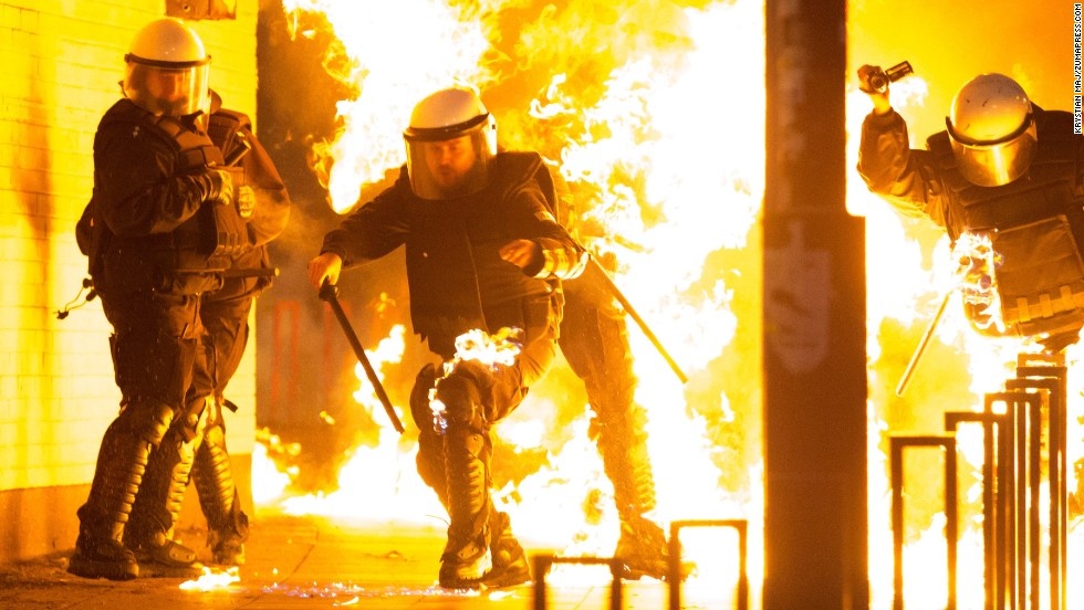 Cảnh sát chống bạo động trở thành ngọn đuốc sống vì bom xăng của người biểu tình trong cuộc đụng độ ngày quốc khánh ở Warsaw, Ba Lan hôm 11/11. Bạo động thường xuyên xảy ra ở Ba Lan trong dịp lễ này hàng năm. Ảnh: Apress