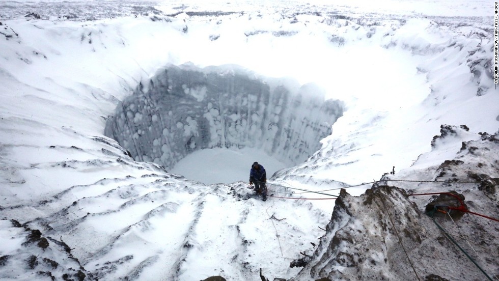 Các nhà khoa học lần đầu khám phá miệng hố tử thần khổng lồ xuất hiện ở Siberia thuộc Nga. Do phần lớn hố bị nước và bùn lầy bao phủ nên người ta phải chờ tới lúc nó đóng băng để thám hiểm. Ảnh: Itar-Tass