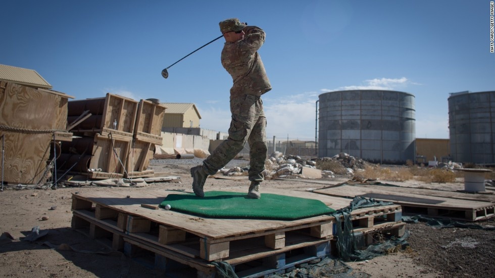 Lính Mỹ chơi Golf ở căn cứ tại Kandahar, Afghanistan hôm 10/11. Người Mỹ đang đóng cửa căn cứ này và chuẩn bị chuyển nó cho phía Afghanistan vận hành. Ảnh: Getty