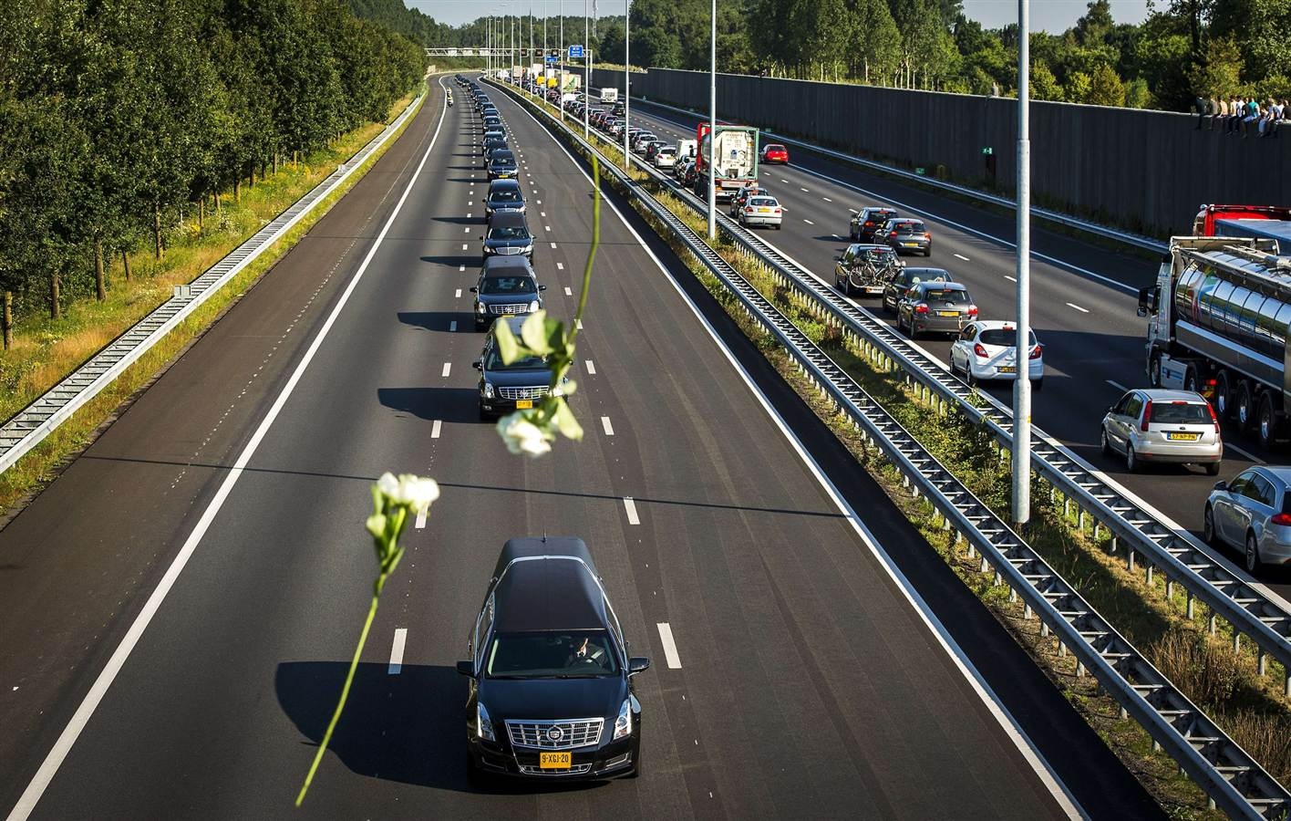 Đoàn xe chở thi thể nạn nhân thảm họa MH17 ở Hà Lan hôm 23/7. Chiếc Boeing 777 của Malaysia Airlines bị bắn rơi ở miền đông Ukraina hôm 17/7 làm 298 hành khách và thành viên phi hành đoàn thiệt mạng. Phe nổi dậy vận chuyển thi thể những người quá cố bằng những toa tàu có khả năng trữ lạnh trước khi máy bay quân sự đưa họ về Hà Lan. Ảnh: AFP