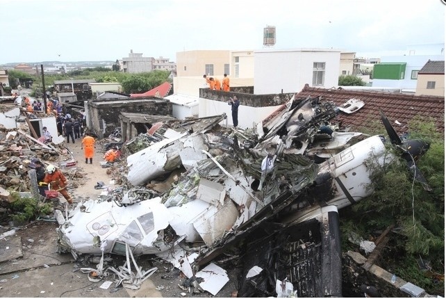 Chuyến bay số hiệu GE222 của hãng hàng không TransAsia Airways gặp nạn khi hạ cánh xuống sân bay trên nhóm đảo Bành Hồ, Đài Loan hôm 23/7. Vụ tai nạn làm 48 người trên máy bay thiệt mạng, 15 người bị thương bao gồm 5 người dưới mặt đất. Ảnh: Sina