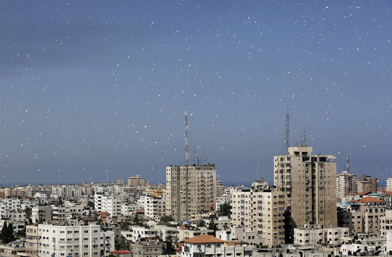 Cơn mưa tờ rơi do quân đội Israel thả xuống thành phố Gaza, yêu cầu thường dân sơ tán trước khi tiến hành không kích hôm 30/7. Ảnh: AFP |
