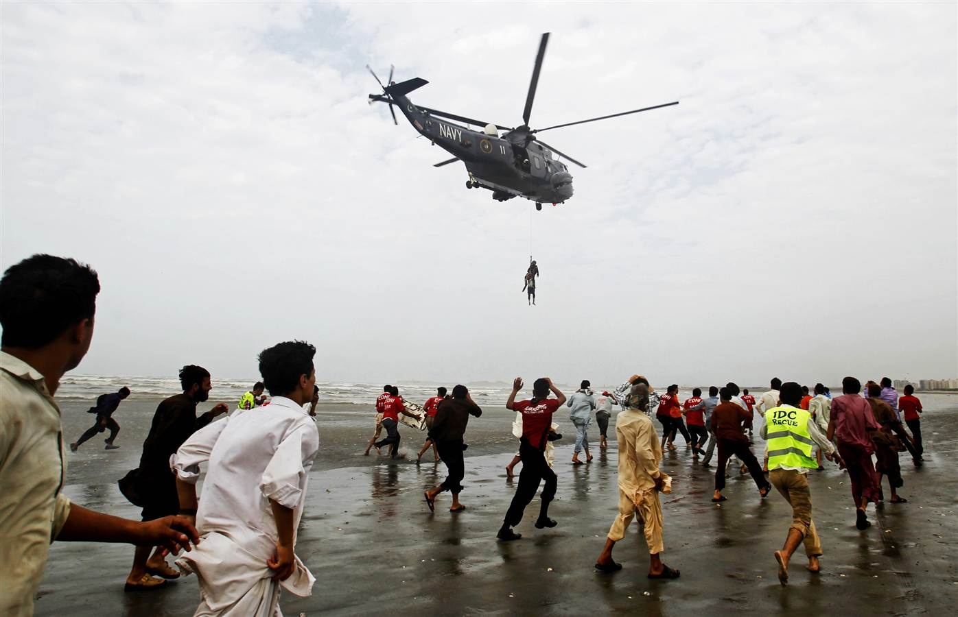 Trực thăng hải quân Pakistan di chuyển thi thể của một người tắm biển chết đuối ở Clifton, Karachi, Pakistan hôm 31/7. Bất chấp lệnh cấm của chính quyền địa phương, hàng ngàn người dân vẫn tập trung tắm ở bãi biển nổi tiếng nguy hiểm này trong dịp lễ Eid al-Fitr của người Hồi giáo. Ảnh: AP |