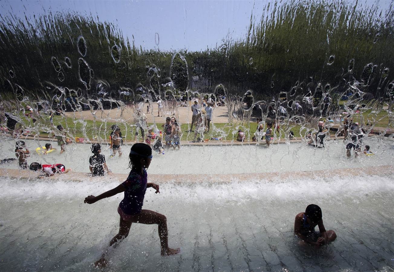 Trẻ em ở thủ đô Tokyo, Nhật Bản tìm tới những đài phun nước công cộng để giải tỏa cái nóng mùa hè hôm 26/7. Ảnh: AP |
