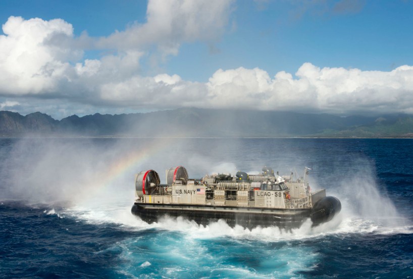 Tàu đổ bộ đệm không khí rời khoang chứa của chiến hạm USS Rushmore hôm 12/7. |