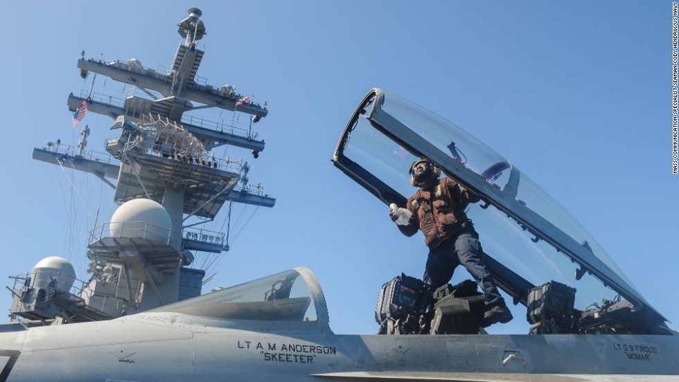 | Chuyên viên bảo dưỡng phản lực chiến đấu F/A-18 Super Hornet trên tàu sân bay USS Ronald Reagan (CVN 76) hôm 26/7. |