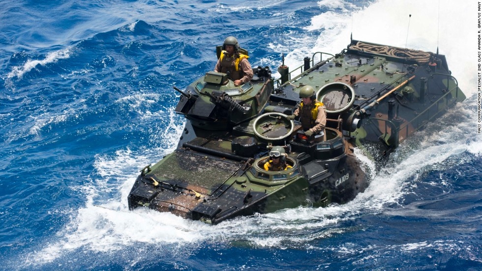 Xe bọc thép lội nước của quân đội Mỹ khởi hành từ chiến hạm USS Rushmore hôm 8/7. |