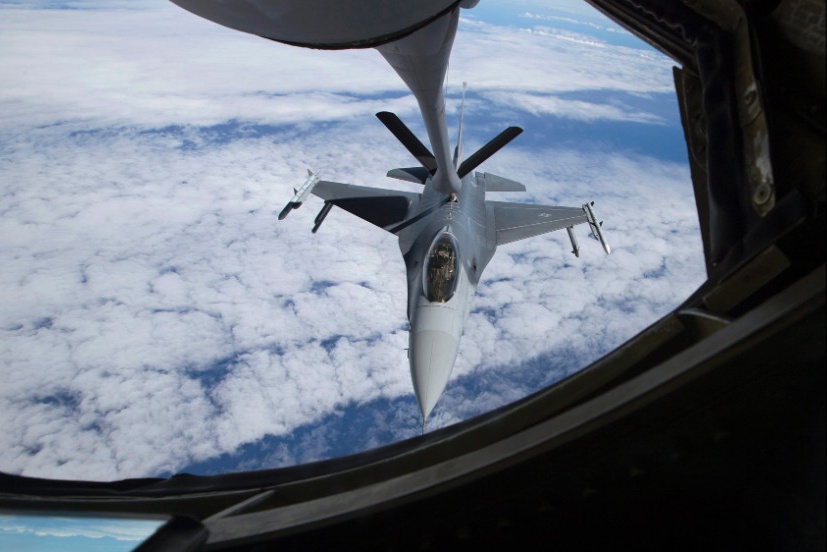 | Phản lực chiến đấu F-16 Mỹ tiếp nhiên liệu từ máy bay KC-135 "Stratotanker" trong bài tập hôm 23/7. |