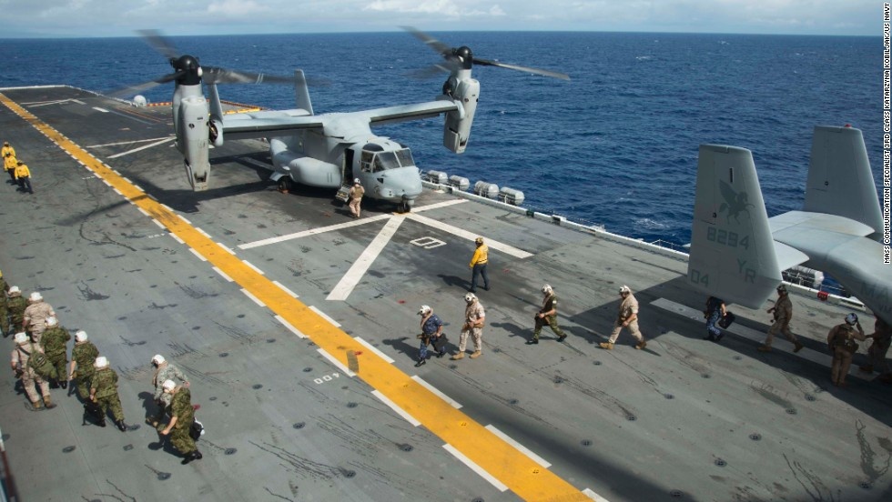 "Quái vật" MV-22 Osprey trên sàn tàu đổ bộ tấn công USS Peleliu của Mỹ hôm 14/7. |