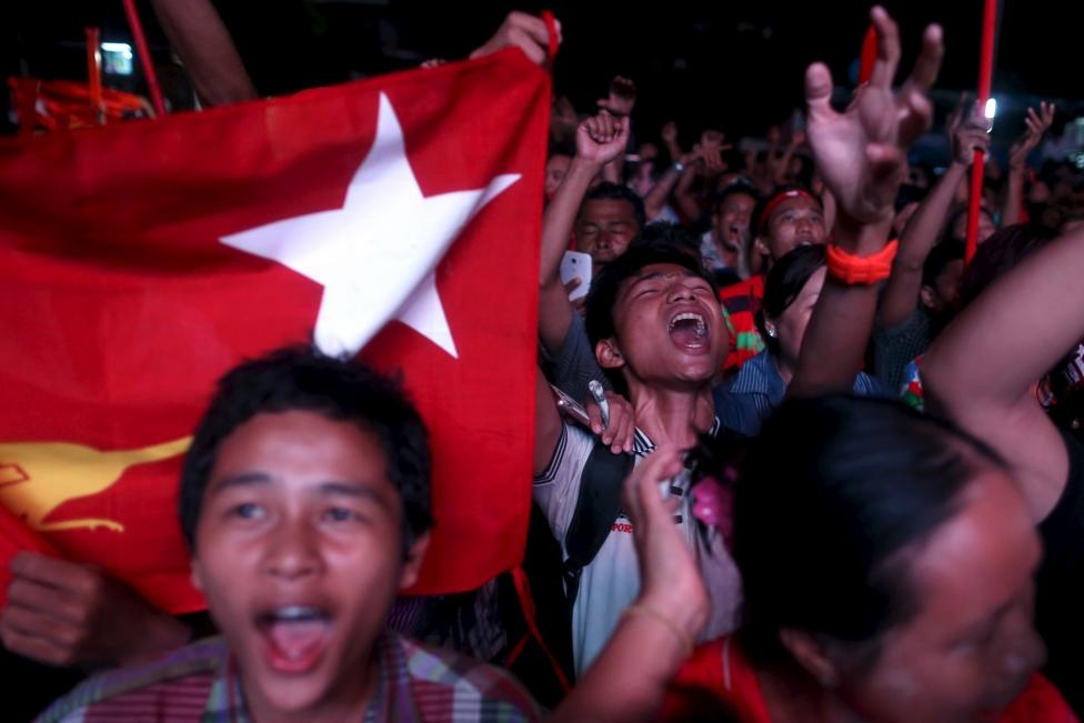 Cử tri ủng hộ bà Aung San Suu Kyi, lãnh đạo đảng Liên đoàn Quốc gia vì dân chủ đối lập (NLD) ăn mừng khi một phần kết quả được công bố trên truyền hình bên ngoài trụ sở của đảng ở Yangon. Theo BBC, kết quả chính thức đầu tiên về cuộc tổng tuyển cử lịch sử ở Myanmar sẽ được công bố vào 9h ngày 9/11 theo giờ địa phương, tức 9h30 sáng nay theo giờ Hà Nội. |