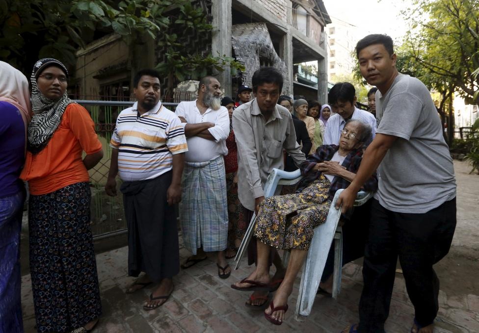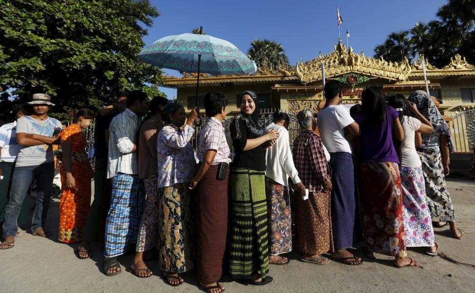 Người dân xếp hàng chờ tới lượt bỏ phiếu. Đây là cuộc tổng tuyển cử dân chủ đầu tiên ở Myanmar trong nhiều thập niên qua. Hơn 30 triệu triệu cử tri cả nước chọn ra các ghế trong quốc hội. Tổng thống sẽ được Quốc hội bầu ra theo Hiến pháp năm 2008. |