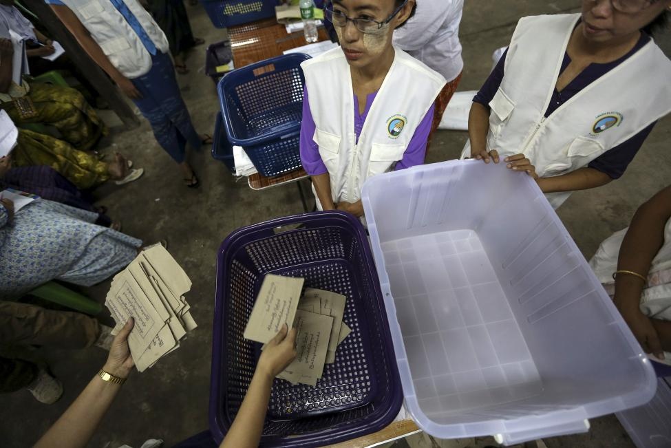 Các tình nguyện viên kiểm phiếu tại một điểm bầu cử tại trung tâm Yangon. Hàng chục ngàn quan sát viên quốc tế đã tới Myanmar để theo dõi quá trình bầu cử. Đảng Liên minh Đoàn kết và Phát triển (USDP) cầm quyền không cần giành số phiếu quá lớn để chiếm ưu thế. Đây là đảng phái chính trị được giới chức quân sự hậu thuẫn. Họ có thể liên minh với 25% số ghế mà quân đội nắm giữ để chiếm phần lớn số ghế trong quốc hội. |