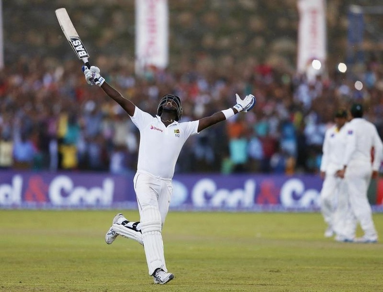 | Đội trưởng tuyển cricket Sri Lanka, Angelo Mathews vui mừng sau khi giúp đội nhà đánh bại đối thủ nhiều duyên nợ Pakistan. |
