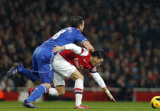 | Hai tiền vệ hàng đầu Mesut Oezil và Lampard tranh bóng với nhau. Cuộc chiến ở khu trung tuyến là điểm nhấn đáng chú ý nhất ở trận derby thành London diễn ra trên sân Emirates. |