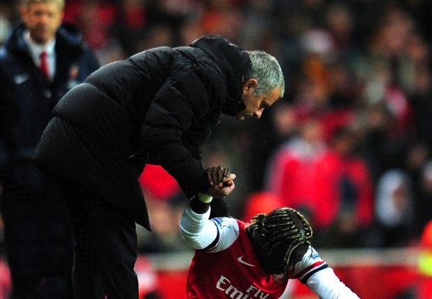 | HLV Mourinho của Chelsea giúp Sagna đứng dậy sau khi hậu vệ phải Arsenal ngã xuống sân do tranh bóng với tiền vệ Lampard. |