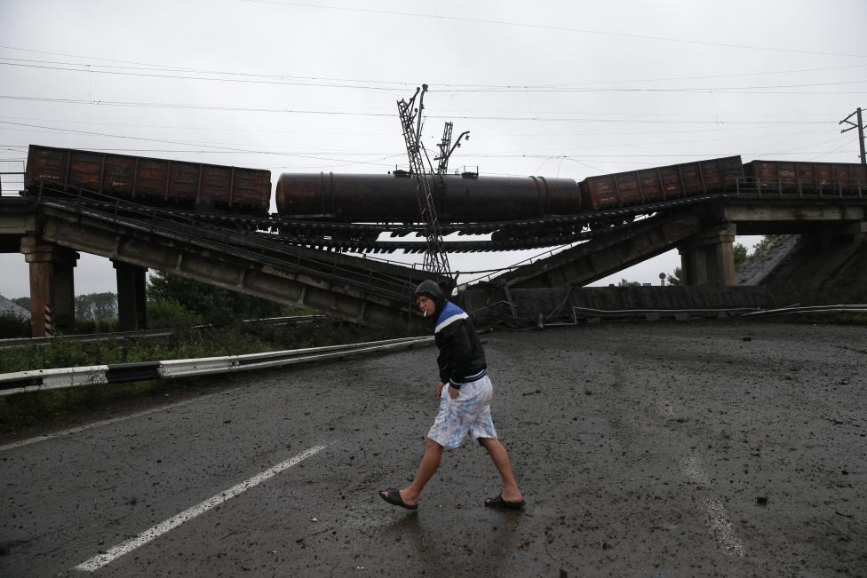 Một cây cầu bị đánh sập ở Novobakhmutivka, miền bắc Donetsk hôm 7/7. Những khối bê tông khổng lồ chặn đứng con đường dẫn vào khu vực phe nổi dậy kiểm soát. |