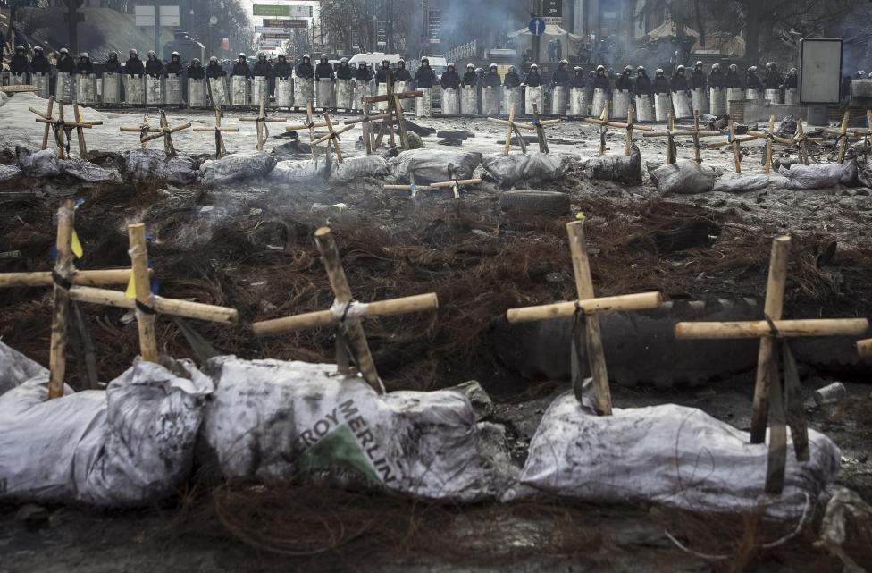 Người biểu tình dựng biểu tượng cây thánh giá nhằm tưởng nhớ những người thiệt mạng trong các cuộc bạo loạn ngày 11/2. Nhiều nguồn tin cho rằng, có những tay súng bắn tỉa bí ẩn, nã đạn vào cả cảnh sát và người biểu tình trong các cuộc đụng độ ở thủ đô Kiev. |