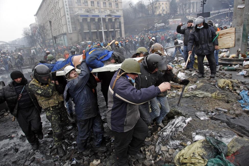 Người biểu tình bị thương được đưa khỏi khu vực đụng độ hôm 20/2. Vài ngày sau, chính quyền của Tổng thống Yanukovych bị lật đổ. Ông này phải bỏ chạy sang Nga trong những ngày cuối tháng 2. Phe đối lập tuyên bố giành chính quyền và lên kế hoạch tổ chức bầu cử. |