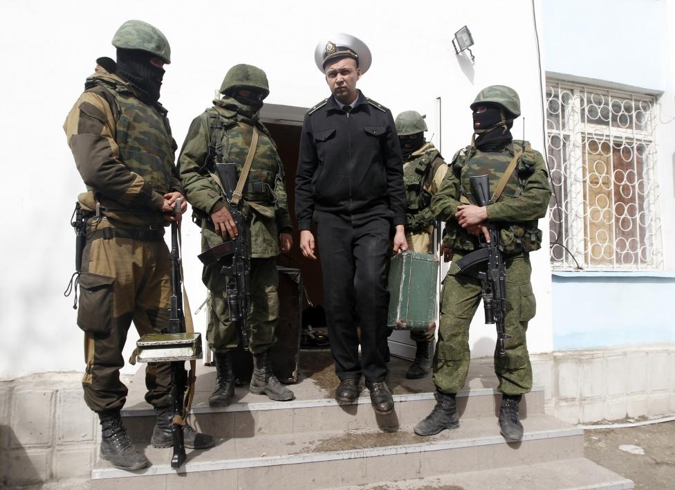 Ngày 11/3, Quốc hội Crimea bỏ phiếu tán thành tuyên bố độc lập khỏi Ukraine. Ngày 16/3, cử tri Crimea tham gia trưng cầu dân ý thông qua việc sáp nhập vào Nga. Một quan chức Hải quân Ukraine (giữa) rời trụ sở trong sự giám sát của các binh sĩ vũ trang không rõ danh tính ở Sevastopol, Crimea hôm 19/3. Tư lệnh Hải quân Ukraine Sergiy Gayduk bị lực lượng này đưa khỏi Trụ sở Bộ tham mưu Hải quân ở Sevastopol. Cờ Ukraine được thay bằng quốc kỳ Nga. |