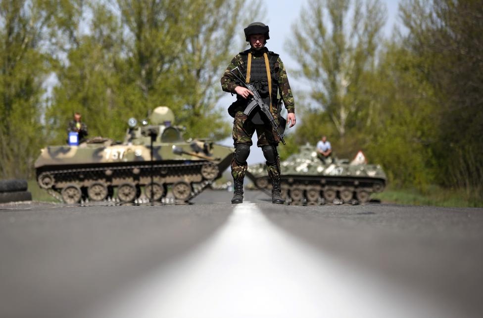 Lính Ukraine chặn các tuyến đường ở Malinivka, đông nam Slaviansk, miền đông Ukraine hôm 27/4. |