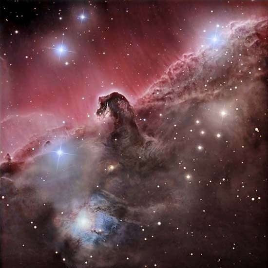 | Tinh vân Đầu Ngựa được nhà thiên văn Bamard phát hiện đầu thế kỷ 20, nằm trong chòm sao Orion cách trái đất khoảng 1500 năm ánh sáng. Từ xa, tinh vân nổi bật trên nền màu đỏ của tinh vân phát xạ IC434 láng giềng. |