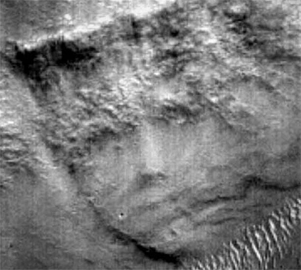 | Một hình ảnh kỳ thú nữa trên sao Hỏa. Khuôn mặt trông như của người Hy Lạp hay La Mã cổ đại đang đội vương miện, các nhà thiên văn đã gọi đây là khu vực Mặt đăng quang. |