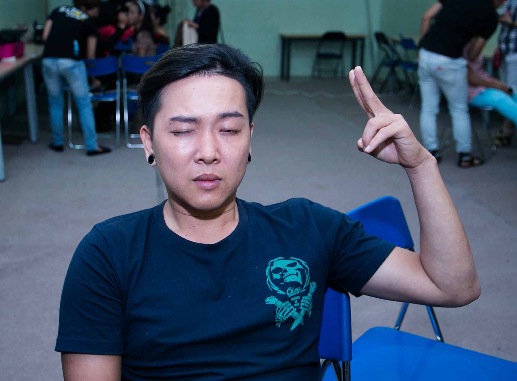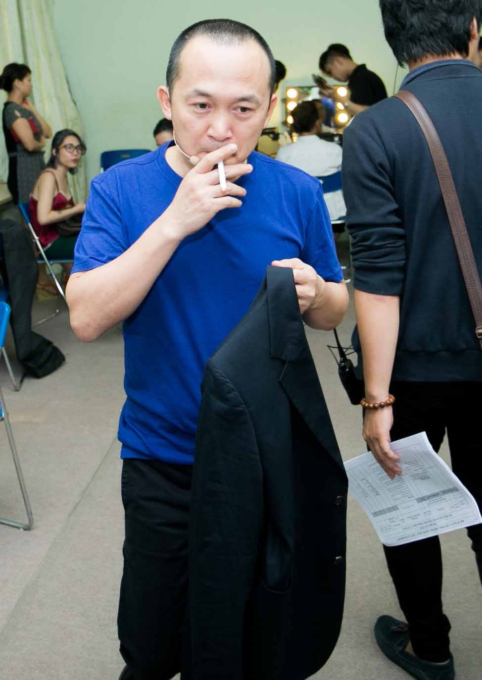 | Quốc Trung tranh thủ phì phèo thuốc lá ở hậu trường. |