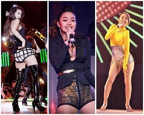 | Minh Hằng với những trang phục phản cảm trên sân khấu. |