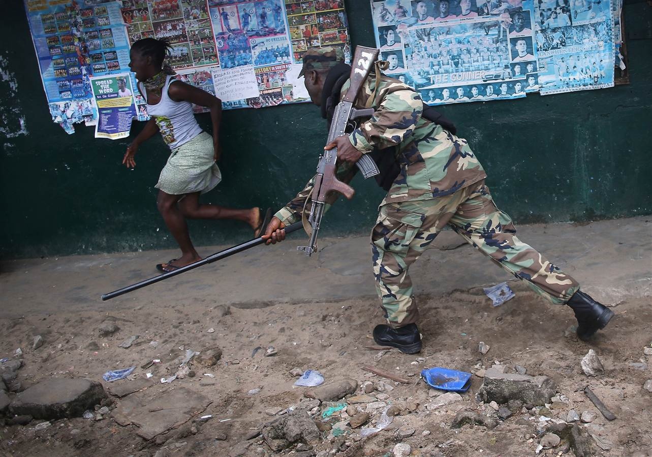 Lực lượng an ninh Liberia thẳng tay đánh đập dân nghèo, những người phản đối chính phủ lập khu cách ly bệnh nhân đại dịch Ebola ở nơi họ sinh sống hôm 20/8. Nhằm ngăn virus Ebola lây lan, chính phủ Liberia đã huy động lực lượng an ninh cô lập khu ổ chuột lớn nhất thủ đô Monrovia và đặt trung tâm điều trị ở Ebola ở trong đó. Ảnh: Getty