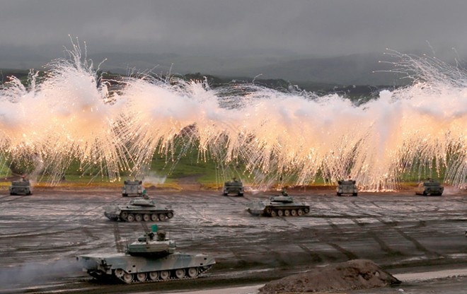 Lực lượng phòng vệ Nhật Bản tổ chức cuộc tập trận bắn đạn thật quy mô lớn dưới chân núi Phú Sĩ với sự góp mặt của nhiều loại vũ khí hiện đại. Khoảng 60 máy bay quân sự và trực thăng tấn công, 80 xe tăng, nhiều loại xe bọc thép và hàng ngàn binh sĩ tham gia cuộc tập trận thường niên tại căn cứ Higashi-Fuji. Hoạt động này bắt đầu hôm 19/8. Ảnh: AP