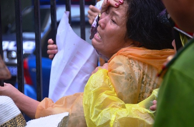 | Mẹ của Tuyến nằm gục bên sân tòa khi con lãnh án tử hình. |