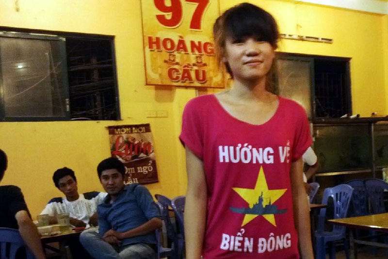 | Một cô gải trẻ phục vụ trong một nhà hàng trên phố Hoàng Cầu với chiếc áo in dòng chữ "Hướng về Biển Đông". |
