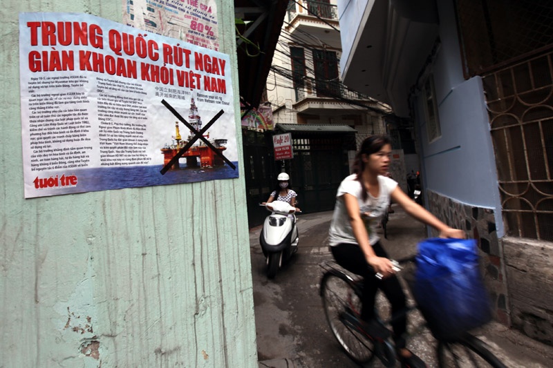 | Lời phản đối việc xâm phạm nghiêm trọng vùng biển Việt Nam của chính phủ Trung Quốc được dán trong ngõ 209 phố Đội Cấn. |