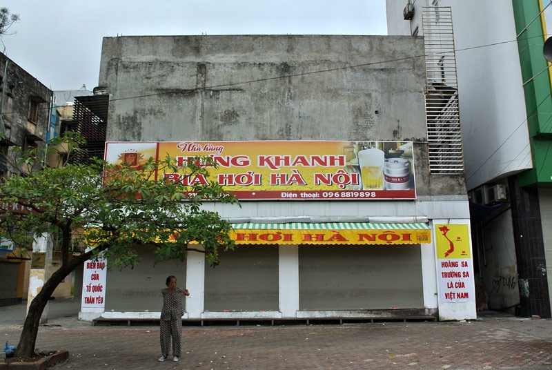 | Một quán bia hơi trên phố Xã Đàn với 2 tấm biển "Vì biển đảo của Tổ quốc thân yêu" và "Hoàng Sa, Trường Sa là của Việt Nam". |