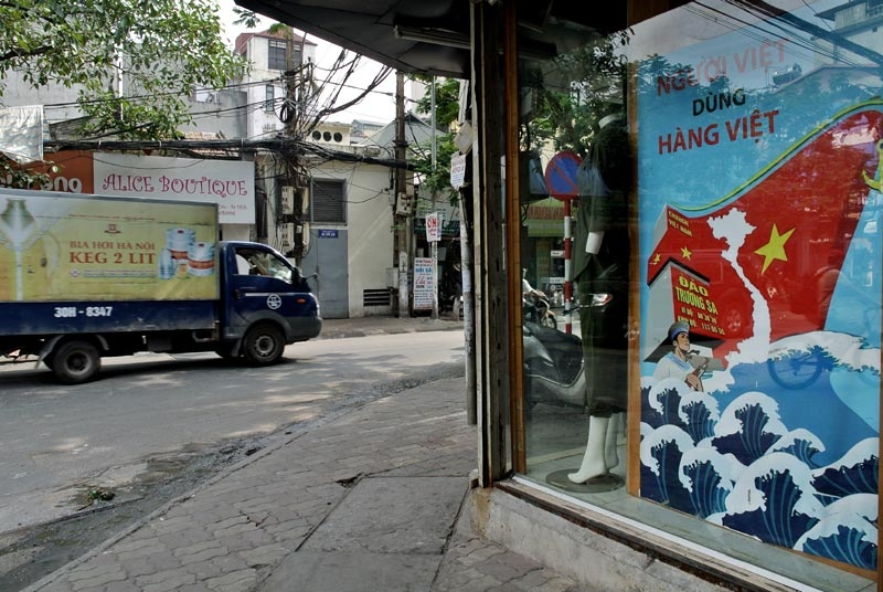 | Một cửa hàng kinh doanh thời trang trên phố Đội Cấn với tấm áp phích khẳng định chủ quyền biển đảo. |