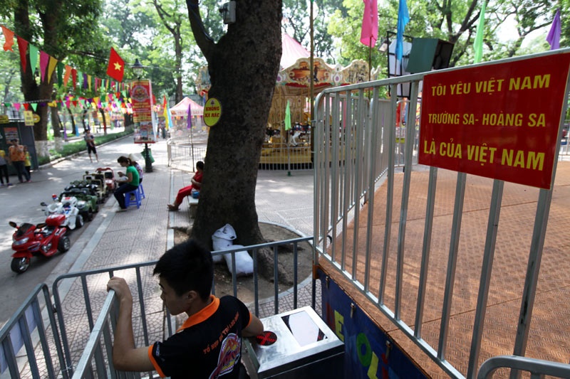 | Tấm biển thể hiện tinh thần yêu nước, khẳng định chủ quyền tại một tổ hợp vui chơi dành cho trẻ em trong công viên Thống nhất. |